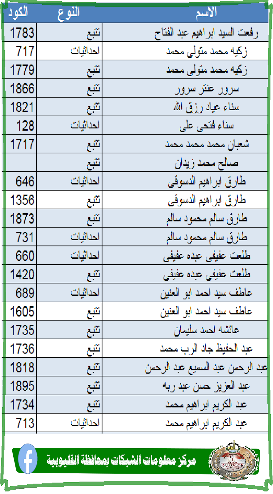 علي الساده الآتى أسمائهم برجاء التوجه إلى مركز معلومات الشبكات بمحافظة القليوبية بفرع بنها وذلك لاستلام شهادة المتغيرات المكانية الخاصة بهم ويتم تسليم الشهادة بالرقم القومي وايصال السداد مع العلم انه يتم تسليم النماذج طوال ايام الاسبوع من يوم الاحد وإلي الخميس ومن الساعه 9 ص وحتى الساعه 2 م